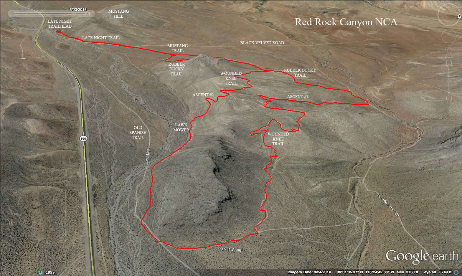 Frenchman Mountain - The starting point for the strenuous out-and-back hike is located at the east end of Bonanza Road. An unmarked trail starts as a gravel road and travels somewhat north around a ridge at the base of the mountain. The trail is fairly easy to follow as it climbs alongside a canyon. About halfway up the mountain the trail essentially ends and the route becomes a scramble up a rocky ridge. Periodically, short sections of trail will appear, but the route continues up the ridge to the peak. The main peak is located just south of the communications towers at the top. Care must be exercised on the return because of some exposed outcroppings. Total distance is 4 to 5 miles with over 2000 feet gain.West Side Canyon Ascent Route