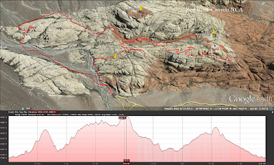 Two Elephants Loop - This strenuous scrambling hike is a 5 mile loop that starts at the Elephant Rock TH on the east side of the park. After hiking up to view the main Elephant Rock formation, it ascends 5 scrambles in a loop to find the Sitting Elephant rock formation. There are 1300 feet of elevation gain. For further information regarding hikes in Valley of Fire, contact Brian Dodd (briandodd (at) cox.net)